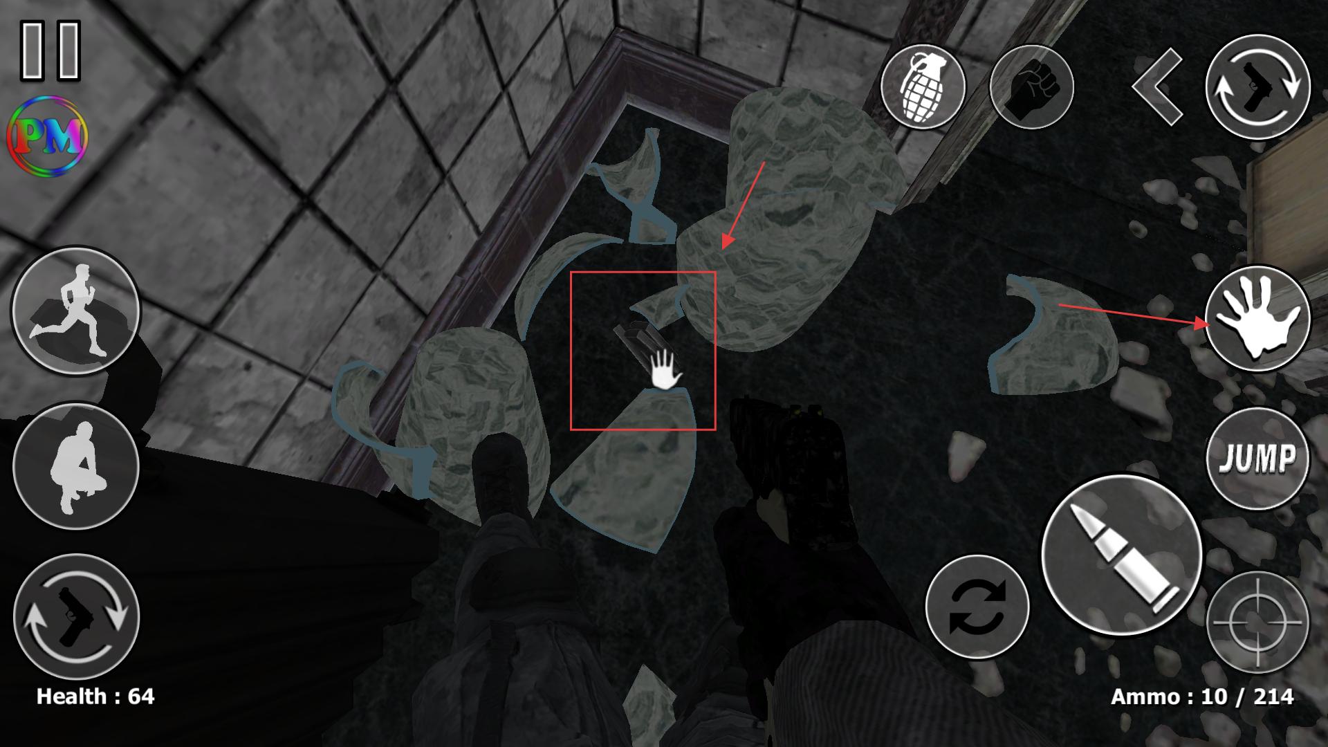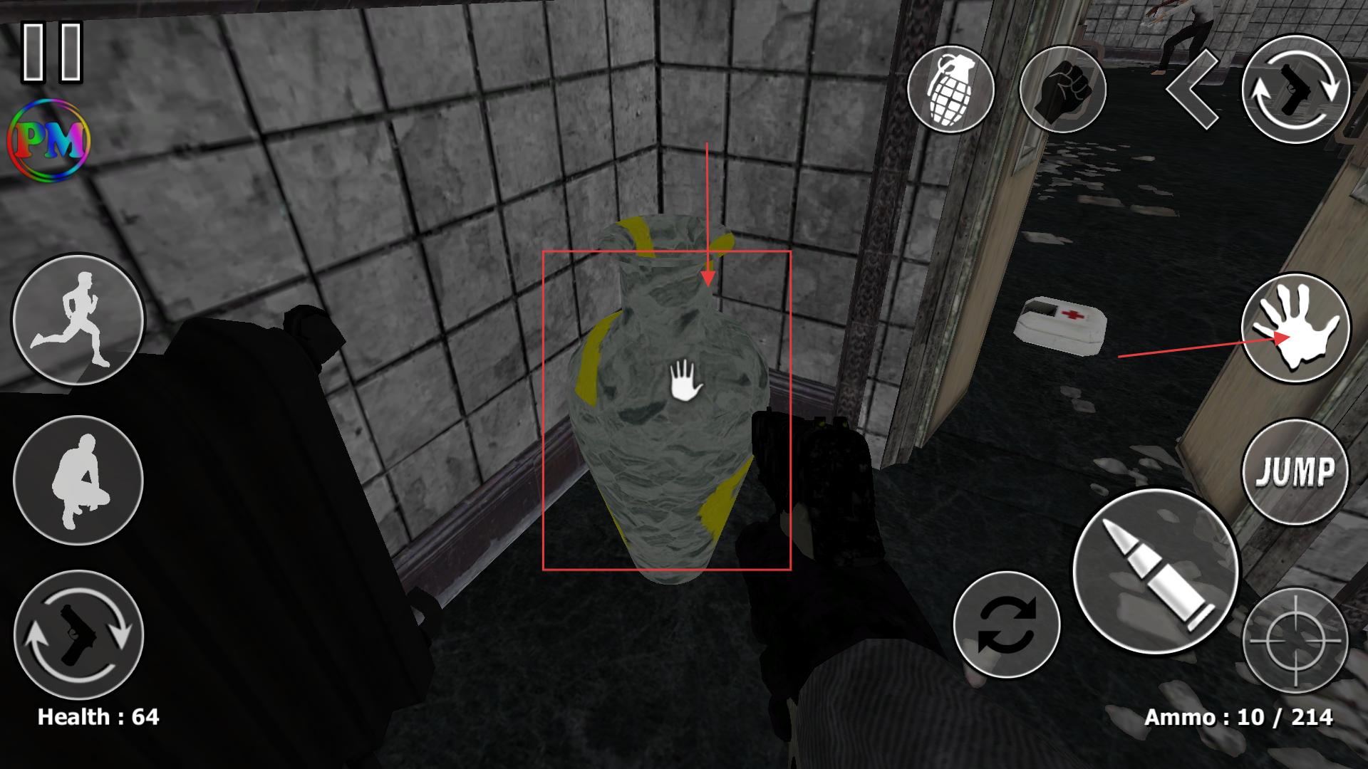 1、場景中出現帶有交互標識的陶罐,點擊右側手形按鍵可觸發交互,這類場景物品通常會掉落資源,是補充彈藥、道具的途徑。