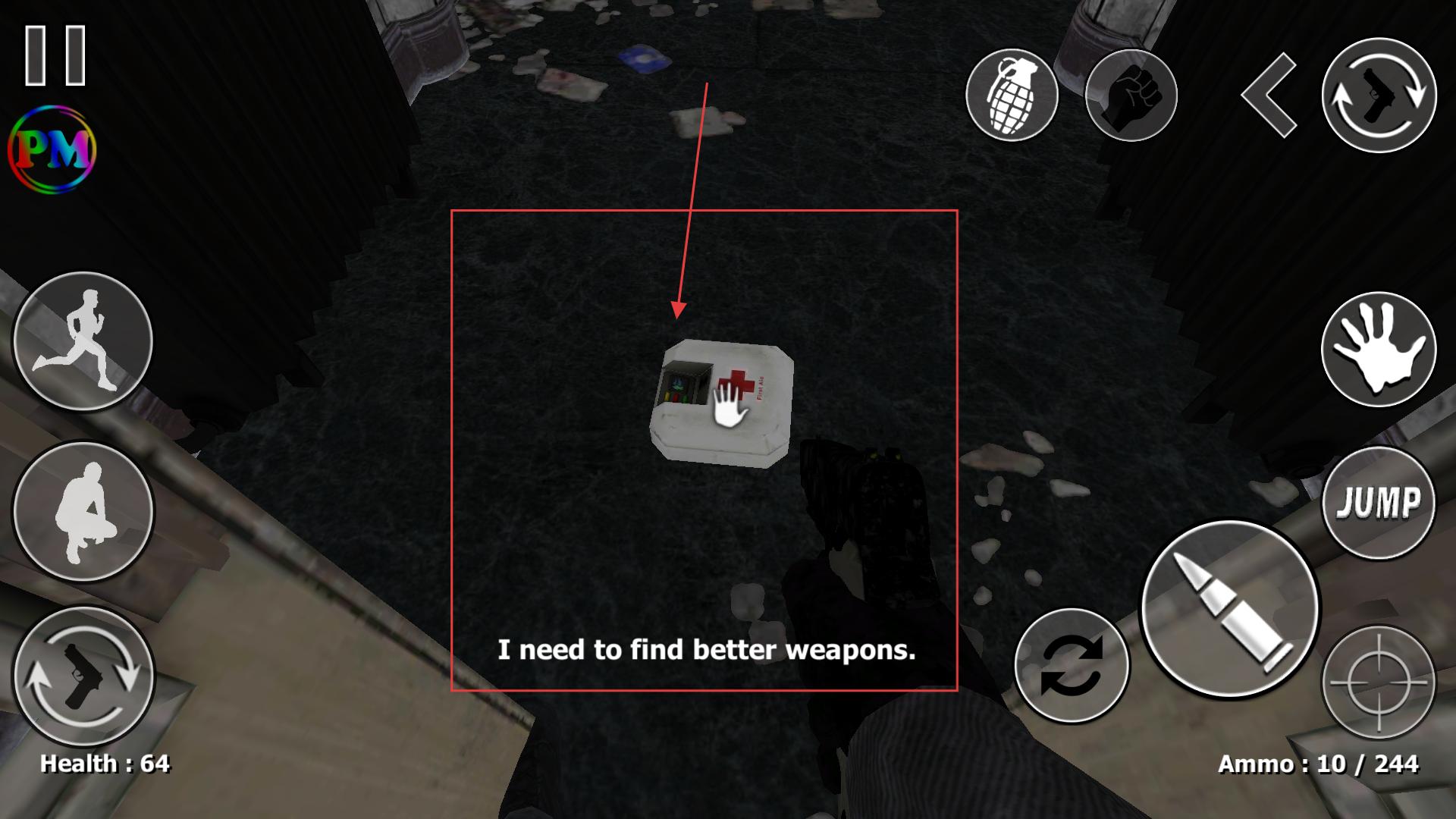 3、發現急救箱,點擊交互按鍵可恢復血量,當前血量偏低,優先拾取急救箱補充狀態,同時留意場景中其他資源點,為后續戰斗做準備。