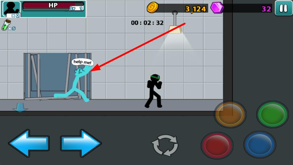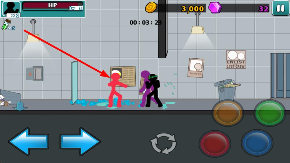 3、建筑內遇到敵人,操控火柴人使用攻擊鍵擊敗紅色敵方角色,戰斗中擊敗敵人可獲得金幣獎勵,該作打擊感強勁,連招系統豐富,支持多種組合攻擊方式。