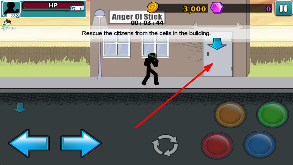 1、進入游戲關卡,界面顯示任務為從建筑牢房中營救市民,需操控火柴人移動至建筑門口,通過方向鍵控制角色移動。