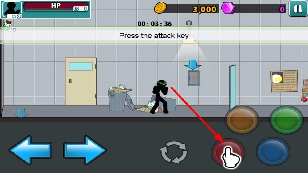 2、進入建筑內部后,界面提示按下攻擊鍵,需點擊紅色攻擊按鈕發起攻擊,游戲采用虛擬按鍵操作,攻擊鍵配合方向鍵可釋放連招,提升戰斗效率。