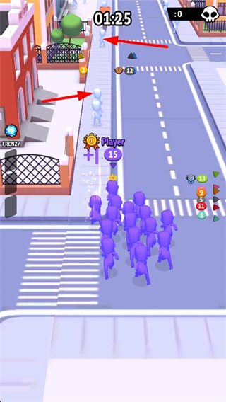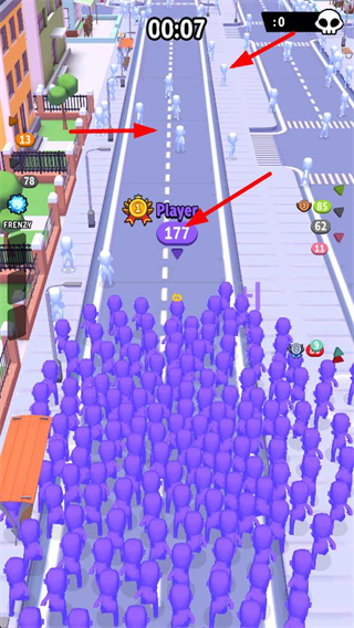 3、操控角色移動,吸納場景里的白色角色,壯大自身的人群隊伍,提升隊伍人數數值。