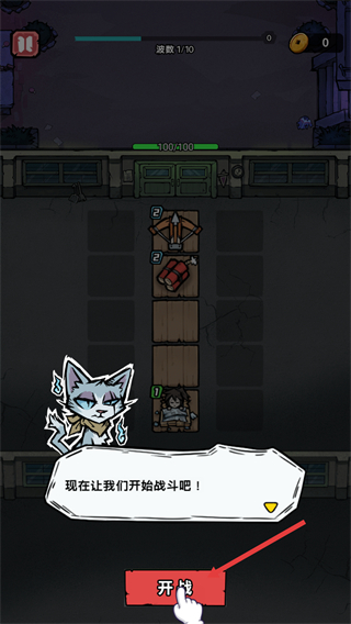 1、界面顯示波數1、大門耐久100,當前有弓箭、炸彈兩種武器,點擊底部【開戰】按鈕即可開啟當前波次的戰斗,迎戰來襲的怪物。