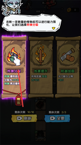 3、擊敗一定數量怪物后會解鎖能力強化選項,此時選擇推薦的【炸彈分裂】,該技能可讓炸彈爆炸后分裂為2個小炸彈再次爆炸,提升群體攻擊效果。