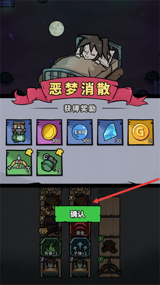 4、通關后會顯示【惡夢消散】的獎勵界面,包含金幣、經驗、鉆石等道具,還有武器數量獎勵,點擊底部【確認】按鈕即可領取獎勵并退出當前界面。