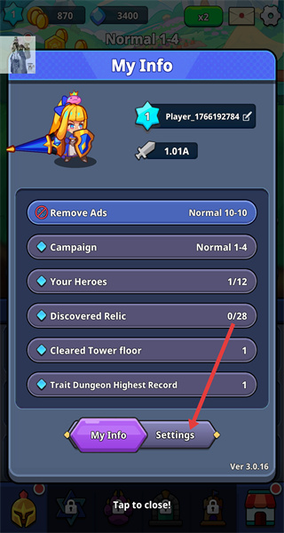 1、進入游戲主界面后,找到界面中的設置相關按鈕,點擊該按鈕可進入個人信息界面,查看當前的游戲相關信息。