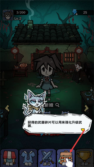 1、界面底部有【武器】選項,獲取的武器碎片可用于強化升級武器,點擊該選項即可進入武器相關界面,后續可在此處進行武器的升級操作。
