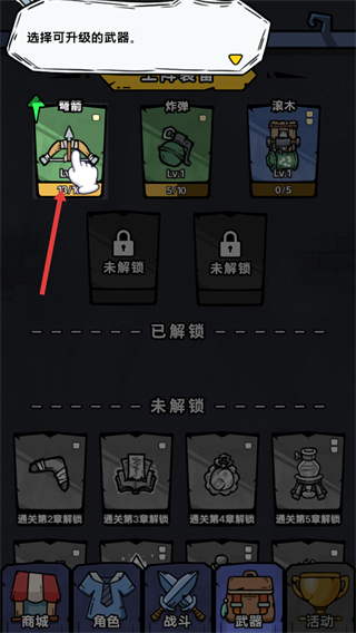 2、進入武器界面后,可選擇已解鎖的武器進行升級,當前顯示弓箭、炸彈、滾木等武器,其中弓箭的碎片數量已滿足升級條件,點擊對應武器即可進入升級流程。
