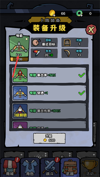 3、升級武器需消耗黃金和武器碎片,升級后不僅能提升武器的基礎屬性,還能解鎖新能力,比如弓箭升級后可獲得暴擊率提升,點擊【升級】按鈕即可完成此次強化。