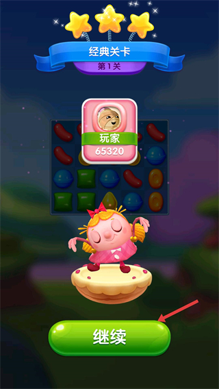 4、進入關卡結算的展示界面后,可看到本次關卡的得分情況,再次點擊繼續按鈕,即可回到關卡選擇或進入下一個關卡。