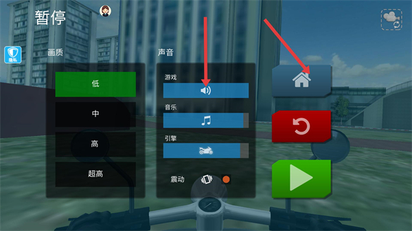 4、進入暫停界面可調整畫質檔位音效音量,同時能點擊主頁按鈕返回游戲主界面重置當前關卡,是管理游戲狀態與設置的功能集合頁。