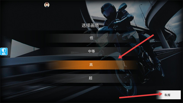 1、進入游戲初始設置界面可選擇畫質檔位,選擇后還能點擊車庫進入車輛管理界面,是調整游戲顯示效果與車輛配置的前置步驟。