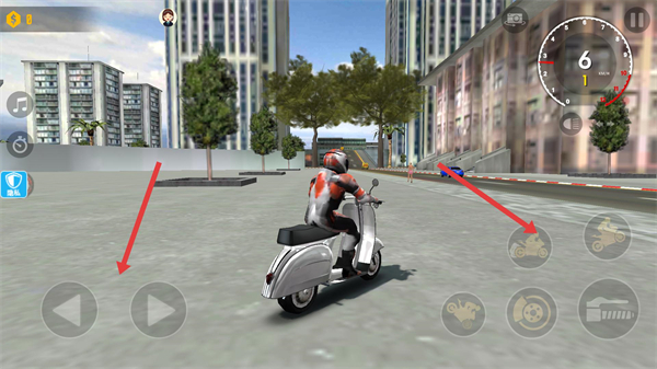 2、游戲駕駛界面左側有方向控制按鈕右側可切換車輛類型,界面上方顯示速度儀表盤,通過操作方向按鈕控制摩托移動。