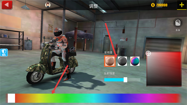 3、在車身調整頁面可選擇預設的車漆顏色,也能通過色條自定義顏色還可調整車漆的反射程度,以此打造獨特的車輛外觀配色效果。