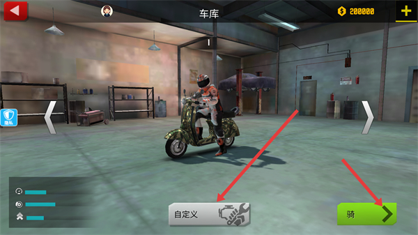 1、車庫界面可通過左右按鈕切換展示車輛,點擊自定義進入車輛管理與使用的核心入口進行車輛調整。