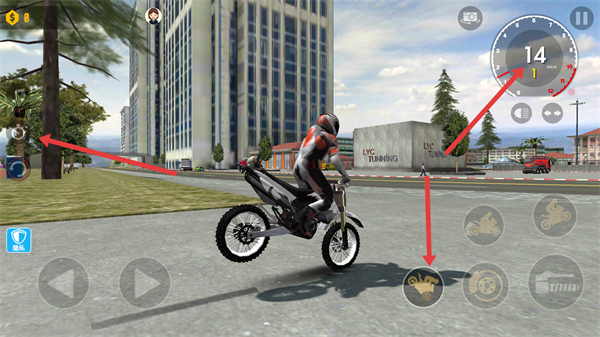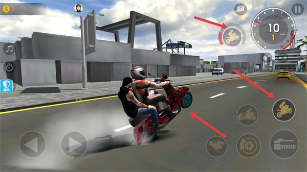 3、進入駕駛界面右側區域可切換已解鎖的車輛類型,左側方向按鈕用于控制摩托的移動方向,同時可觸發漂移等操作提升駕駛樂趣。