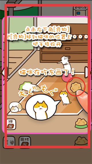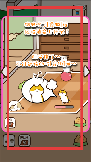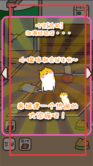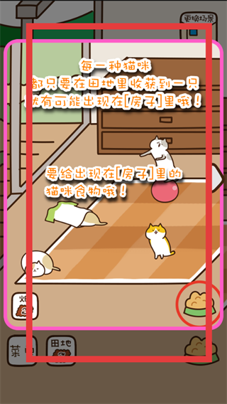 1、在田地里收獲貓咪,收獲到的貓咪會出現在房子里面,之后要給房子里的貓咪喂食,推進貓咪的培育流程。