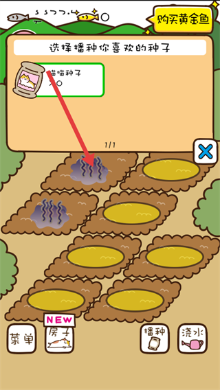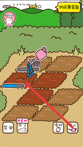 3、播種后點擊澆水按鈕,給播下種子的田地澆水,促進種子的生長,為后續長出貓咪做準備。