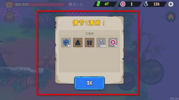 4、完成情節關卡后會彈出獎勵界面,界面中會顯示已獲得的道具和資源,點擊確認按鈕即可領取這些獎勵,繼續挑戰后續關卡。