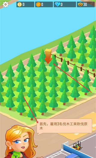 1、進入游戲先看指引,按提示雇用3名伐木工,點擊對應區域安排他們去砍原木,開啟木材獲取流程。