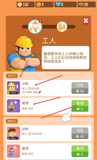 2、打開工人界面,在伐木工板塊,用金幣雇用新工人,也可訓練現有工人提升效率,助力原木砍伐。