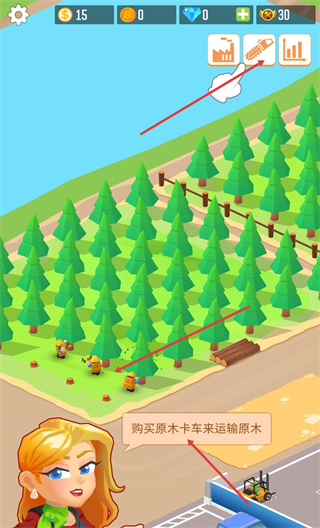3、留意界面上方功能,購買原木卡車,點擊對應圖標,讓卡車運輸砍伐好的原木,推進生產環節。