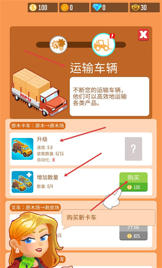 4、進入運輸車輛界面,用金幣購買新卡車增加數量,還能升級現有卡車,提升原木運輸效率。