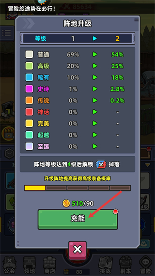2、進入陣地升級界面后,可見等級1升至2級的品質概率變化,底部顯示當前貨幣滿足消耗要求,按指引點擊【充能】按鈕,可完成升級前的充能步驟,推進陣地升級流程。