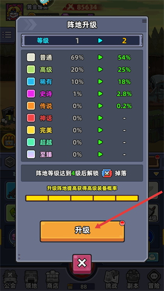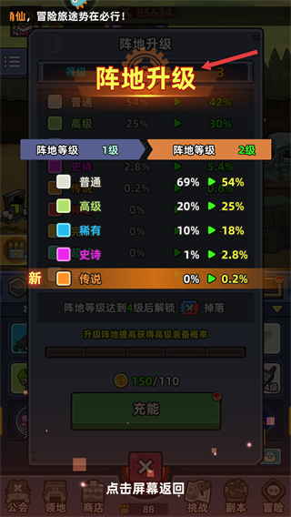 4、升級成功后,界面顯示陣地等級從1級升至2級的品質概率變化,底部提示點擊屏幕返回,此時陣地升級流程完成,可返回主界面繼續后續探索,升級效果已成功生效。