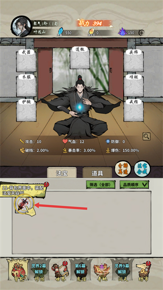 2、進入背包界面后,可見裝備欄與法寶列表,底部提示需裝配的天焱劍已顯示在列表中,按指引點擊該法寶,可打開其詳情界面,推進裝配流程,無需其他額外操作。