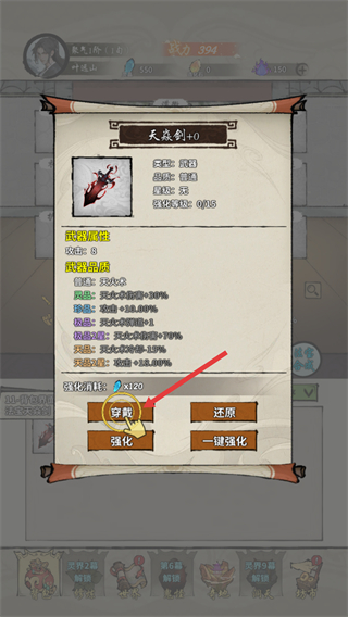 3、打開天焱劍詳情界面后,可見其屬性、品質及操作按鈕,按指引點擊【穿戴】按鈕,即可完成該法寶的裝配,裝配后將提升角色對應屬性,此步驟為任務的核心操作。