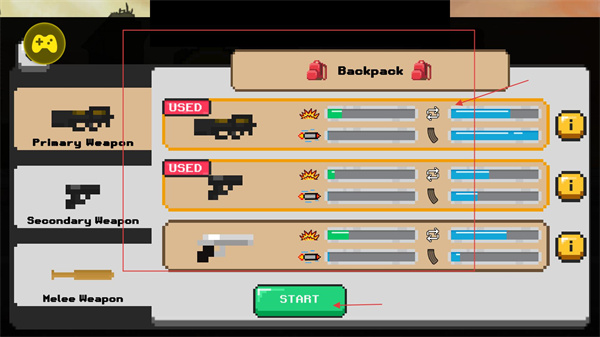 2、背包界面展示主武器、副武器等裝備欄,部分裝備標注表示已使用,可通過裝備欄切換武器配置,點擊按鈕可進入。