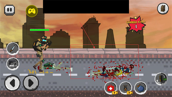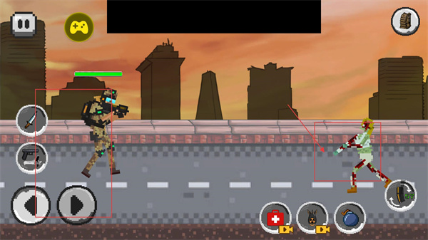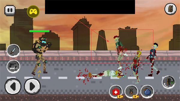 1、戰斗界面左側有武器切換與移動控制鍵,右側配備急救包、投擲物等道具,需先鎖定僵尸目標,利用武器攻擊。