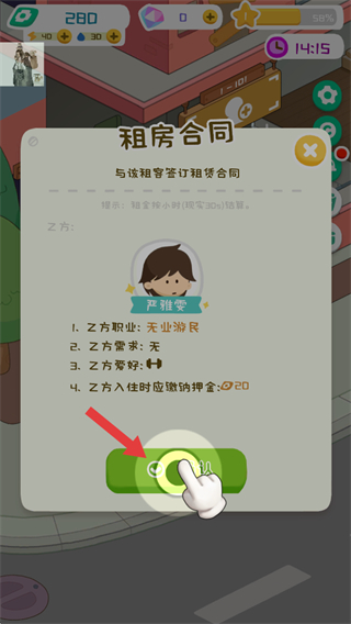 4、招募成功后彈出租房合同界面,顯示租客的職業、需求等信息,租客入住需繳納押金,點擊擬按鈕可簽訂合同,完成后租客即可入住房間,開始產生對應收益。