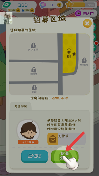 3、進入招募區域界面,可選擇招募的區域,當前可選小芳街,界面顯示無業游民類租客的要求,點擊招募按鈕可嘗試招募該租客,滿足條件后即可達成招募。