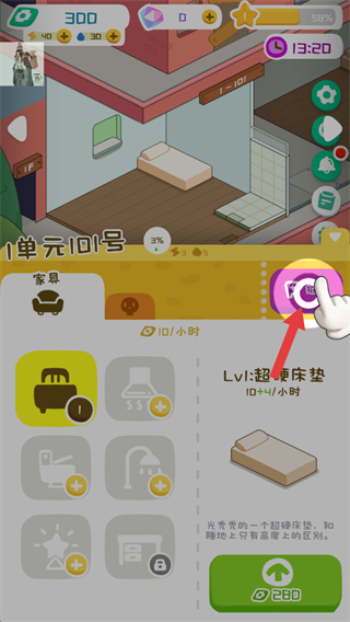 2、進入房間后可看到家具界面,當前房間有超硬床墊等家具,點擊對應家具的升級按鈕可提升家具等級,升級后能增加每小時的收益數值,助力積累更多資源。