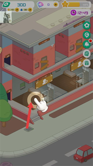 1、界面顯示資源數值,建筑包含多個單元房間,跟隨指引點擊指定區域可進入對應房間,后續可在房間內進行家具布置、招募租客等操作,推進租房相關流程。