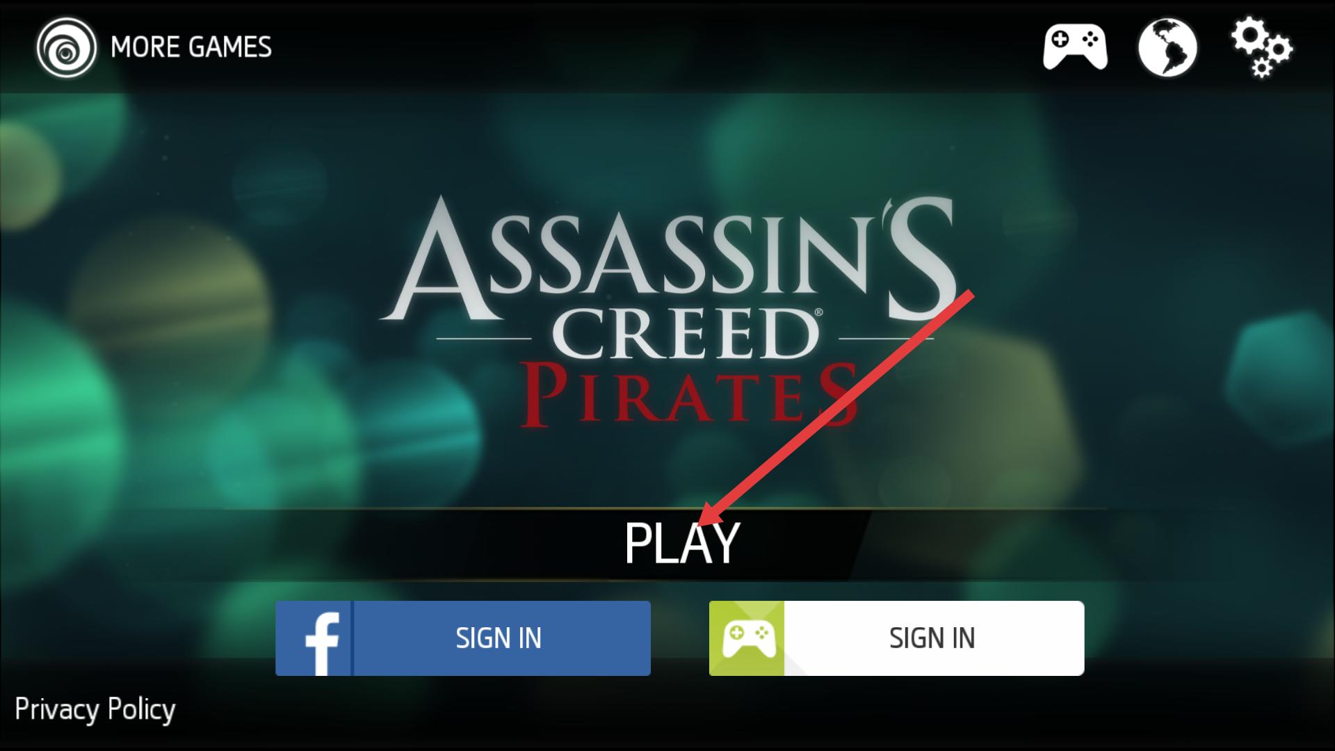 1、在游戲啟動界面點擊PLAY按鈕進入游戲,也可通過社交賬號SIGNIN同步進度,開啟海盜題材的航海冒險。