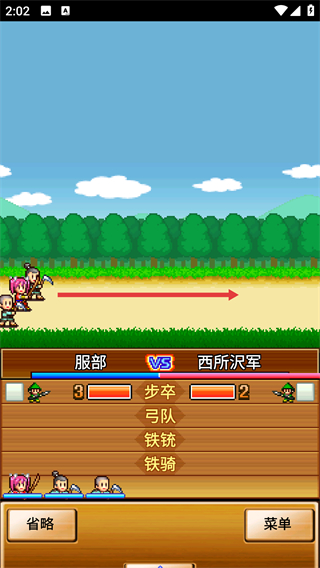 4、進入戰斗界面后,可看到雙方部隊的對陣情況及單位狀態,戰斗會自動推進,也可點擊“省略”按鈕加快流程,戰斗勝利后即可獲得該領地,拓展自身勢力范圍。