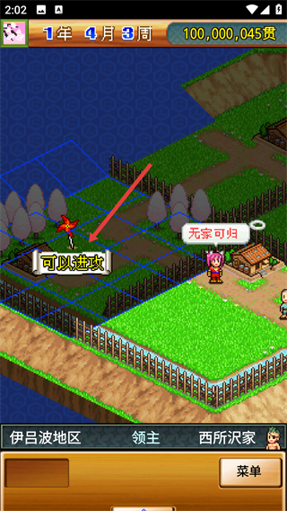 1、界面顯示當前時間為1年4月3周、資源數值,看到帶有可以進攻標識的區域,點擊該區域可進入領地攻略流程,后續可查看該領地的詳細信息并發起進攻。