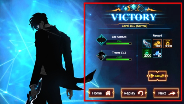 4、成功擊敗敵人通關后,會顯示勝利界面,可查看獲得的經驗和獎勵,之后選擇對應的按鈕返回主頁、重玩關卡或是進入下一個關卡繼續挑戰。