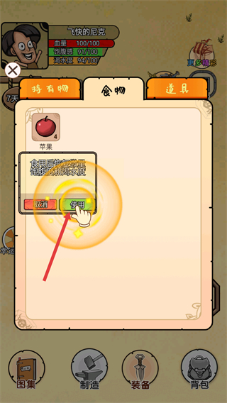 3、選中蘋果后會彈出操作選項,顯示【食用后恢復微量飽腹度和渴水度】的說明,點擊【使用】按鈕即可消耗該蘋果,提升角色對應的狀態數值,需按需選擇使用。