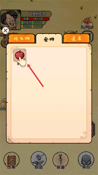 2、進入背包界面后,會顯示持有物、食物、道具等分類,選中收集到的蘋果,可查看其相關信息,這一步是使用物品前的必要操作,方便確認物品用途及數量。