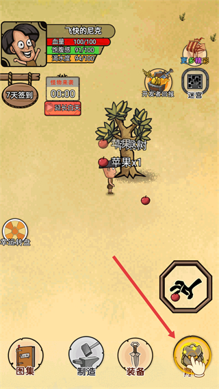 1、界面中可看到角色狀態及場景里的蘋果樹,獲取蘋果后,點擊底部背包按鈕可進入背包界面,這是管理物品的入口,需及時將收集到的資源存入背包以便后續使用。