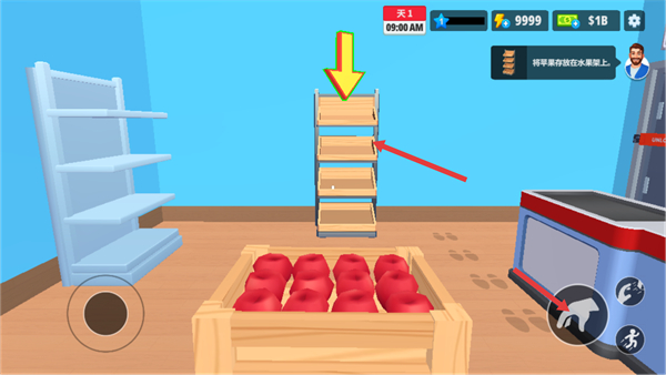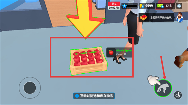 1、看到帶有物品的盒子時,先找到界面右側的互動按鍵,點擊該按鍵可拿起對應物品盒,完成拾取后才能進行后續的商品擺放操作。