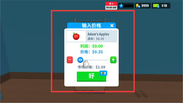 4、觸發價格調整后會彈出輸入價格的窗口,可看到商品成本與市場價格,通過加減按鍵調整售價,點擊好按鈕即可確認商品定價。