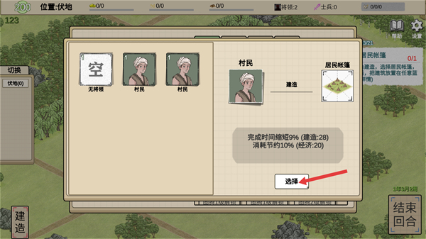 3、選擇居民帳篷的建造人員,可看到村民參與建造能縮短完成時間、節約消耗,確認后點擊選擇按鈕,即可安排人員推進建造,提升建筑的建設效率。