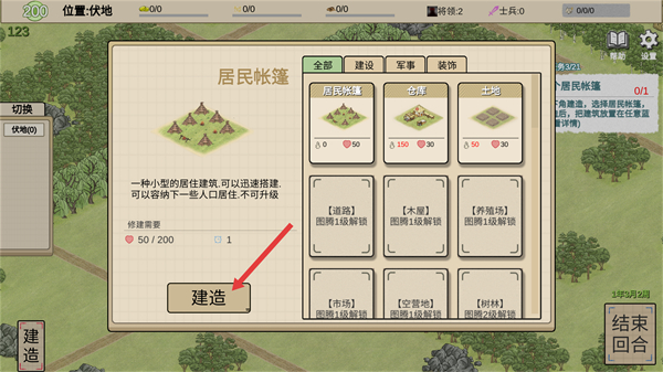 2、進入建造界面后,選擇居民帳篷,查看其建造需求,消耗對應資源后點擊建造按鈕,即可開啟建筑流程,居民帳篷可容納人口居住,是初期發展的基礎建筑之一。