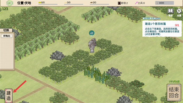 1、需建造居民帳篷,點擊左下角建造按鈕,后續可在建筑列表中選擇對應建筑,放置在藍色區域完成建造,推進任務進度的同時,為后續人口居住做準備。