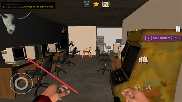 4、教程任務要求前往網吧,到達網吧場景后,可看到多臺電腦設備,同時界面顯示可領取196貨幣,按指引操作即可完成該環節任務并獲取獎勵。